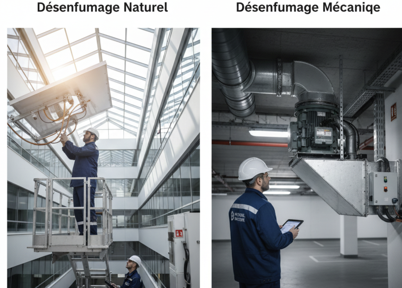 Le désenfumage mécanique : Utilisation de ventilateurs d'extraction et de moteurs pour aspirer les fumées, principalement dans les parkings et les grands immeubles (IGH).